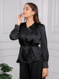Made from Premium thick Italian satin fabric, this outfit is perfect for office meetings, helping you stand out with elegance and confidence. Designed in a flattering free size, it comes with a belt to cinch the waist for a tailored fit—suitable for sizes Small to XL. The smooth, breathable fabric ensures all-day comfort, making it an ideal choice for long workdays or business events. Stylish, versatile, and easy to wear, it's the perfect blend of sophistication and ease.
