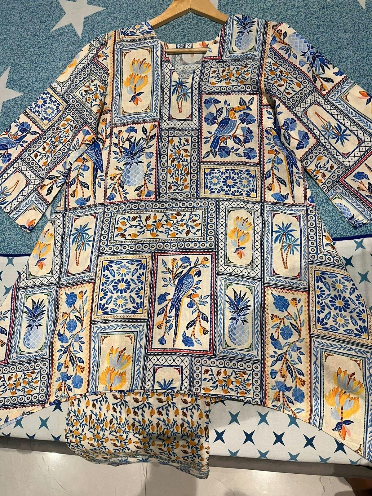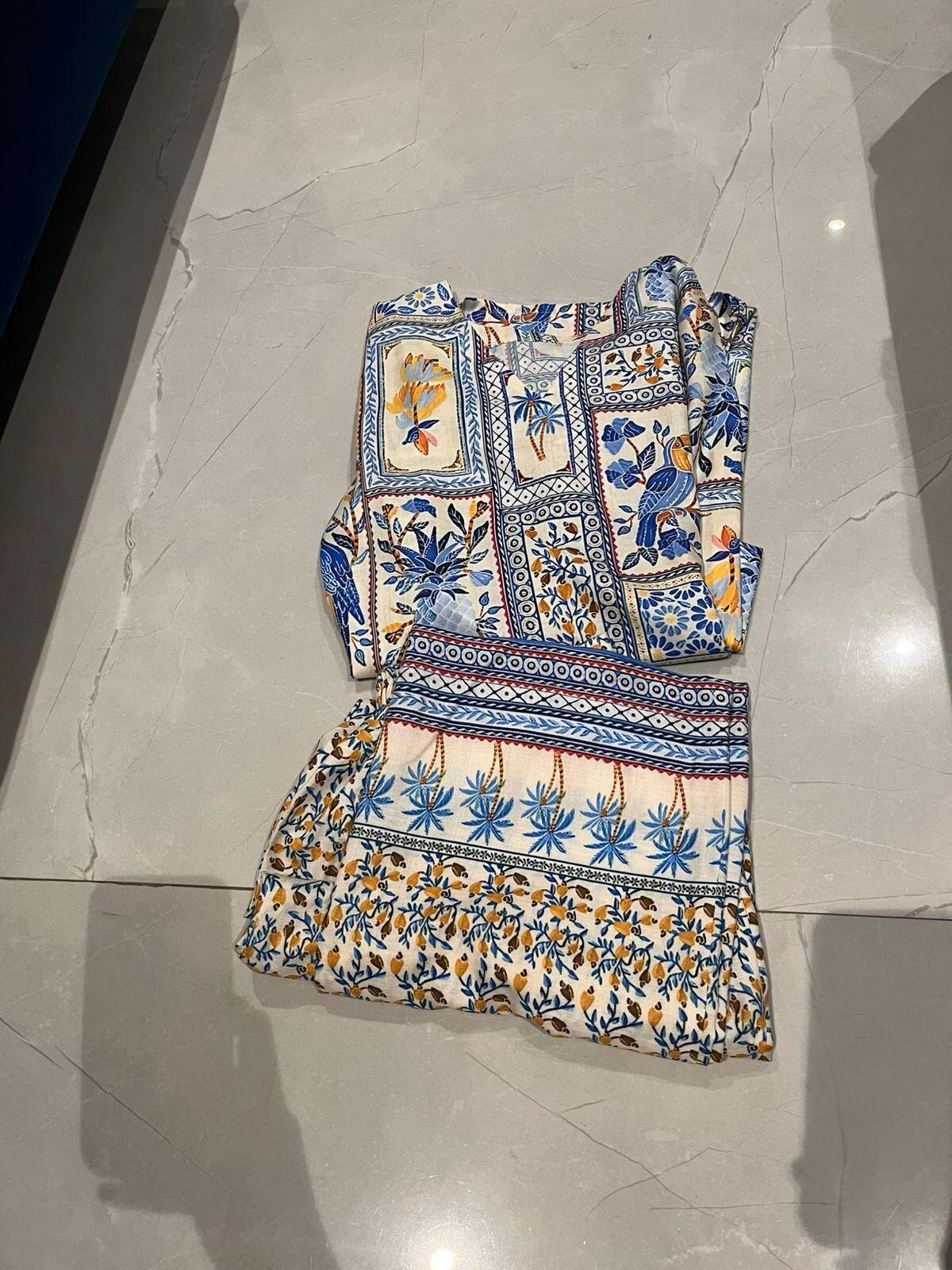 Made from soft, breathable linen-cotton fabric, this outfit is designed for all-day comfort and effortless style. Printing detailing adds a touch of elegance, making it perfect for any occasions, small gatherings, or casual outings. Featuring 3/4 sleeves and a relaxed, loose fit, the outfit is paired with matching palazzos that include convenient pockets on both sides—ideal for keeping essentials like your phone or keys close at hand. Lightweight and versatile, it’s a go-to choice for comfort, function, and understated charm.