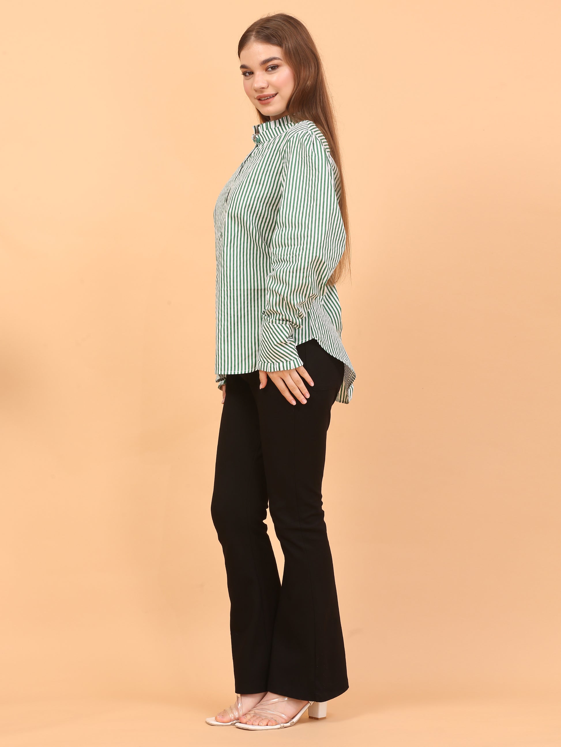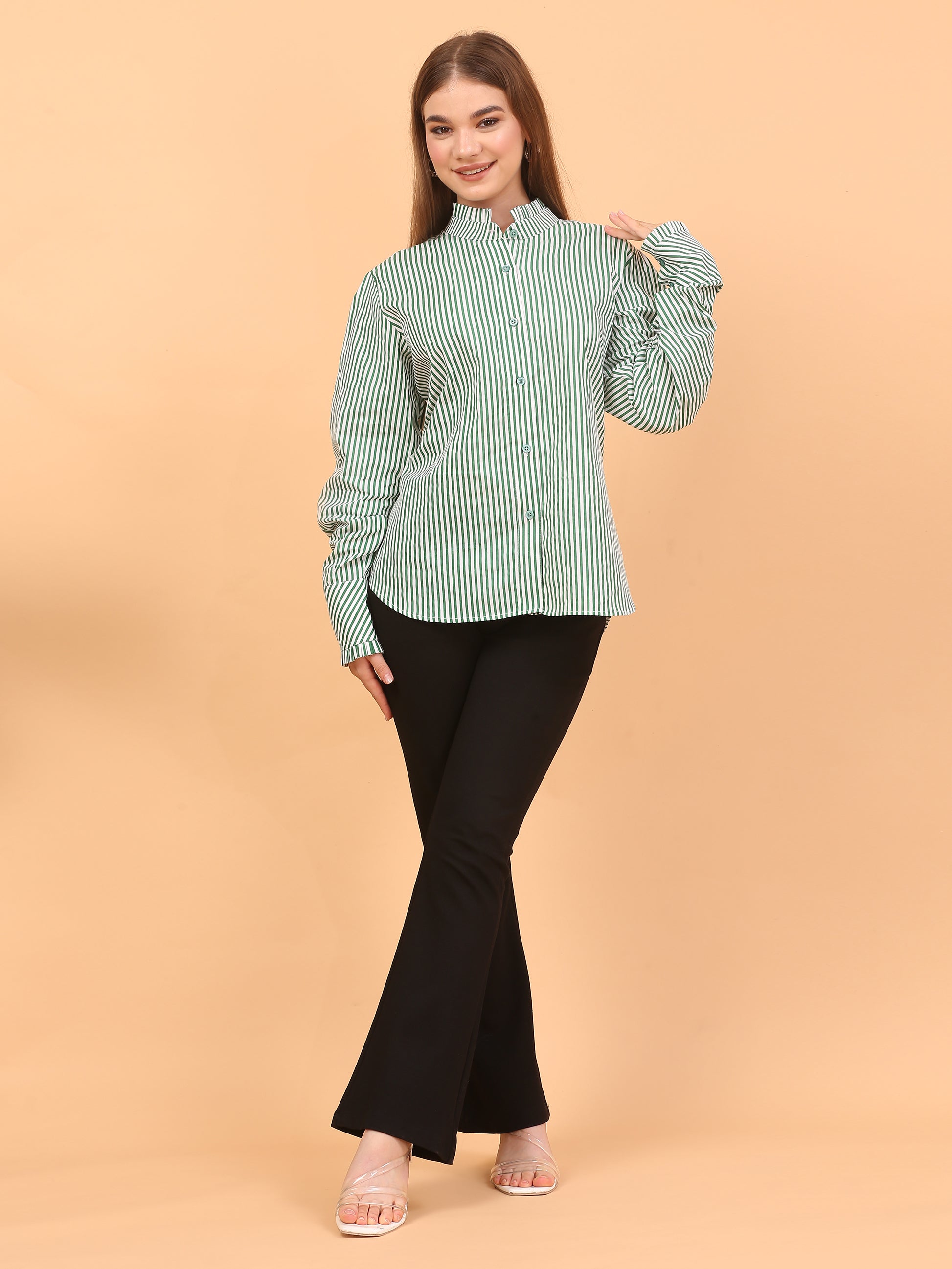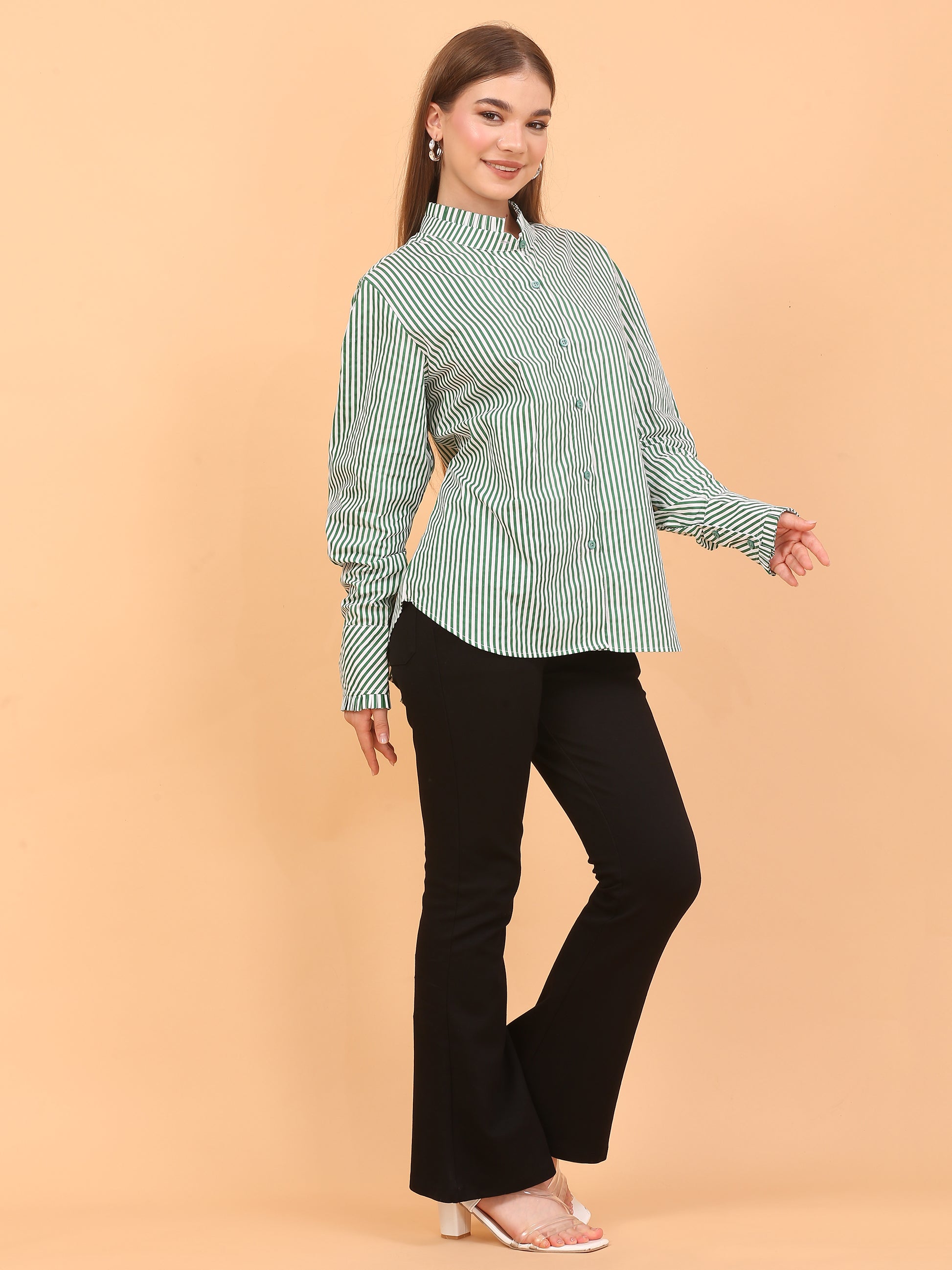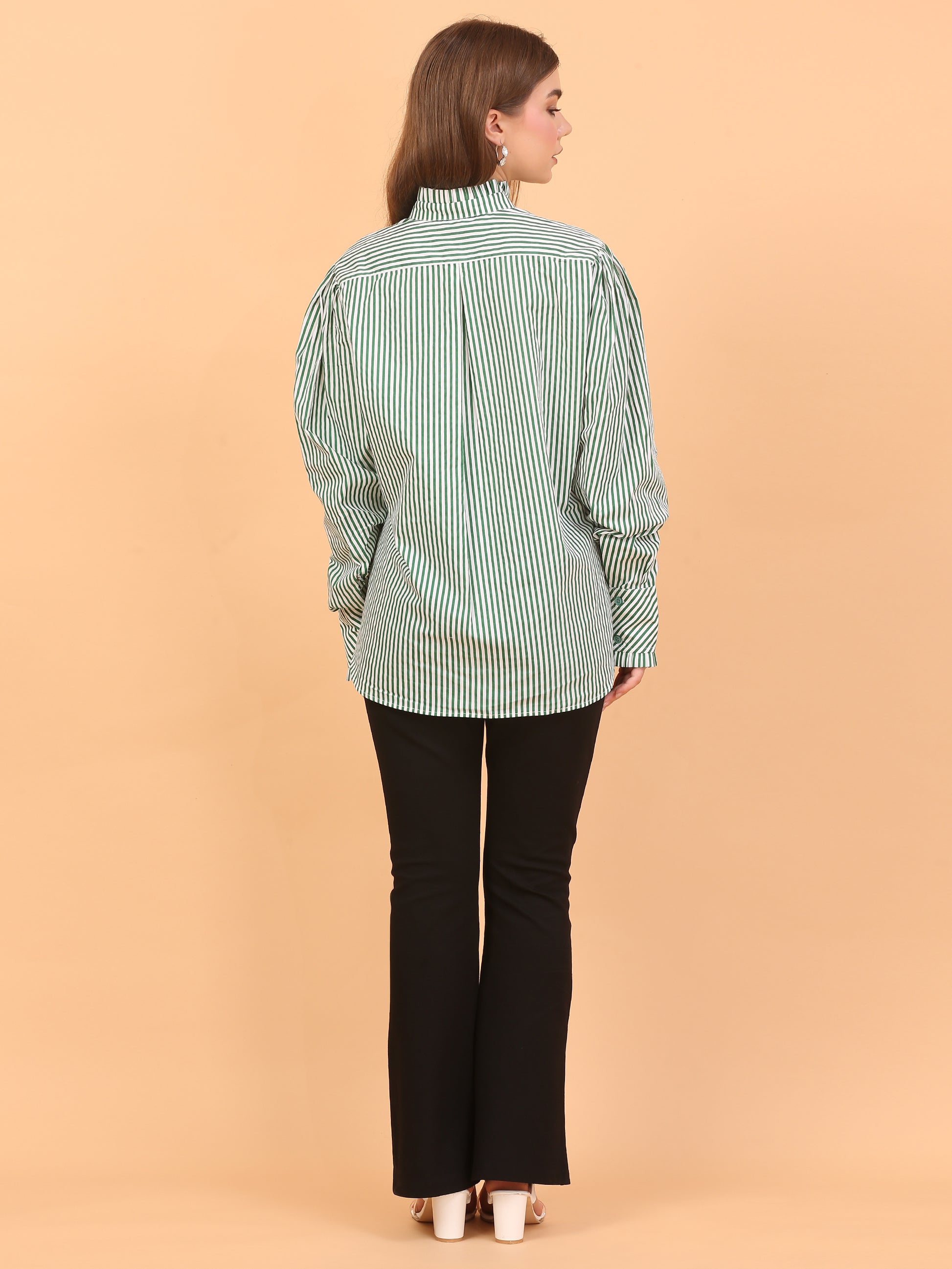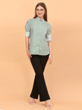 Stay comfortable and stylish from 9 to 5 in this loose-fit striped, green shirt. Made from soft, breathable cotton fabric, it's perfect for both office days and casual outings. The polka dot detailing on the sleeves adds a playful touch, while the relaxed fit keeps you feeling easy and breezy all day long. Pair it with matching pants or mix it up—this shirt is lightweight, versatile, and can be styled in multiple ways. A go-to piece for everyday comfort without compromising on style.