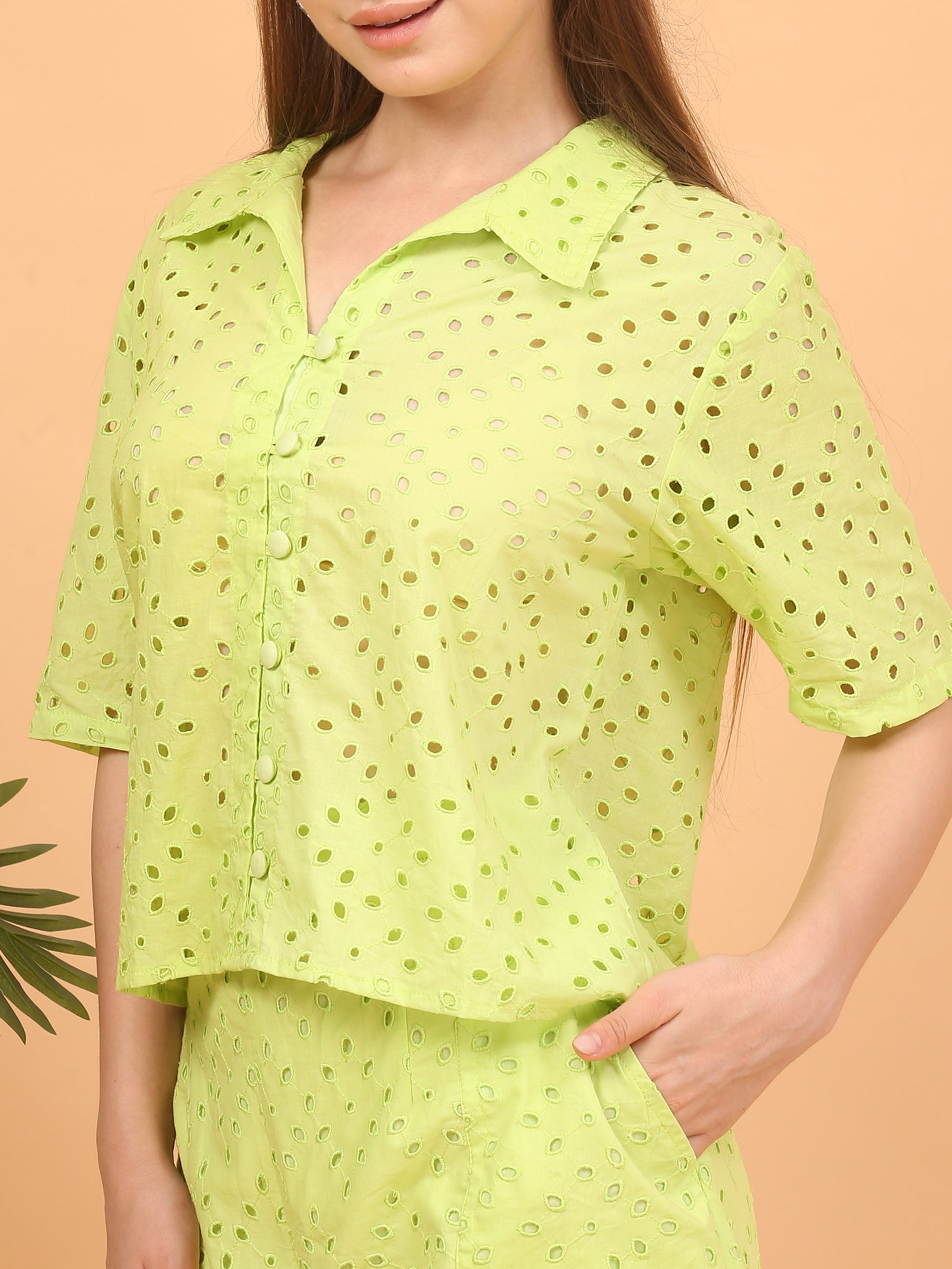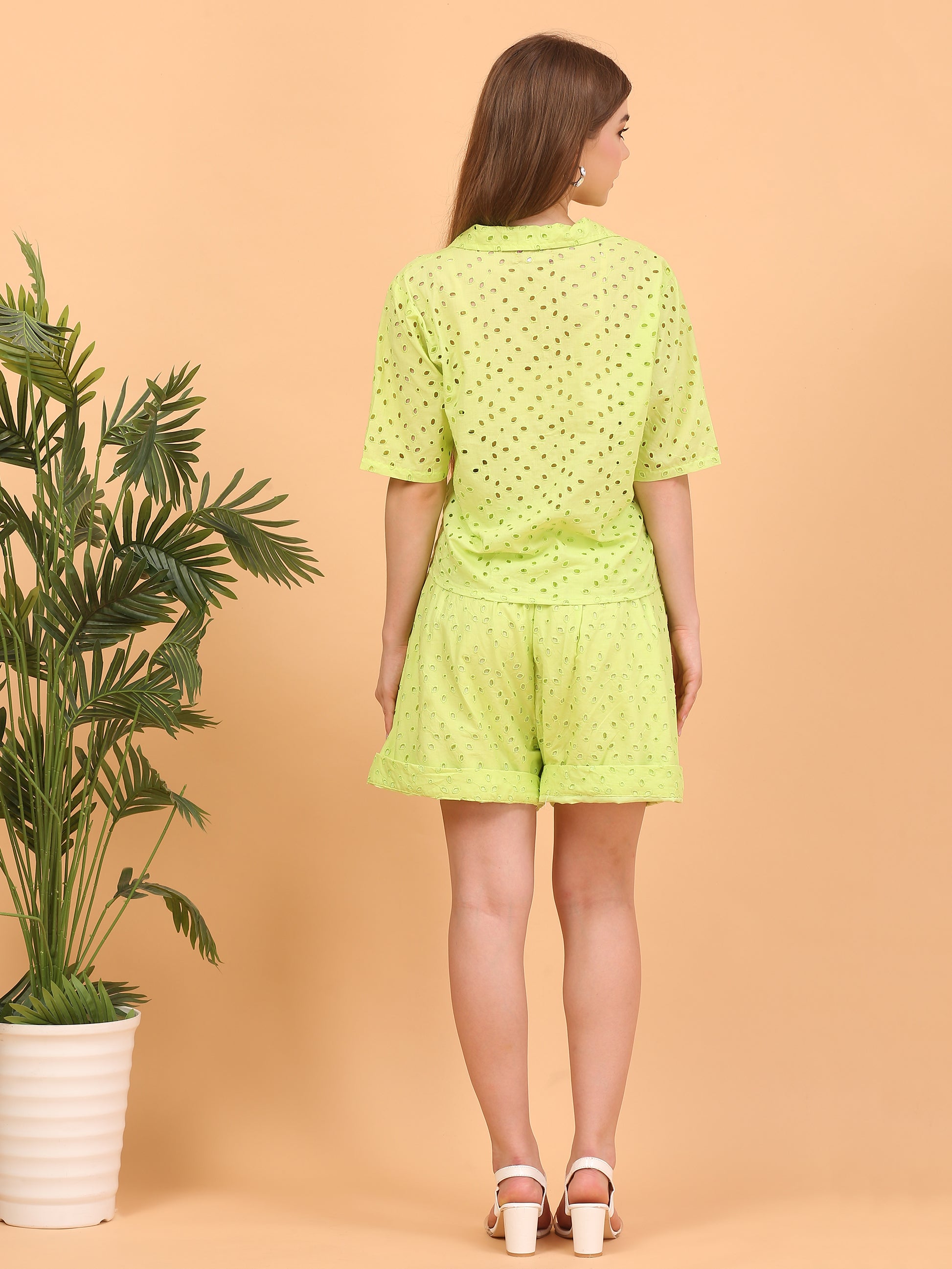 Stay comfortable and stylish in this Schiffli cord set, featuring a loose-fit green shirt and matching shorts made from soft, breathable cotton. Perfect for vacations, weekend plans, or casual outings, this set exudes relaxed, effortless charm. The airy fit keeps you cool all day, while the long pockets add a playful touch. Not in the mood for shorts? Pair the shirt with matching pants for a more covered look. Lightweight, versatile, and chic—this set is your go-to for everyday comfort without compromising on style.