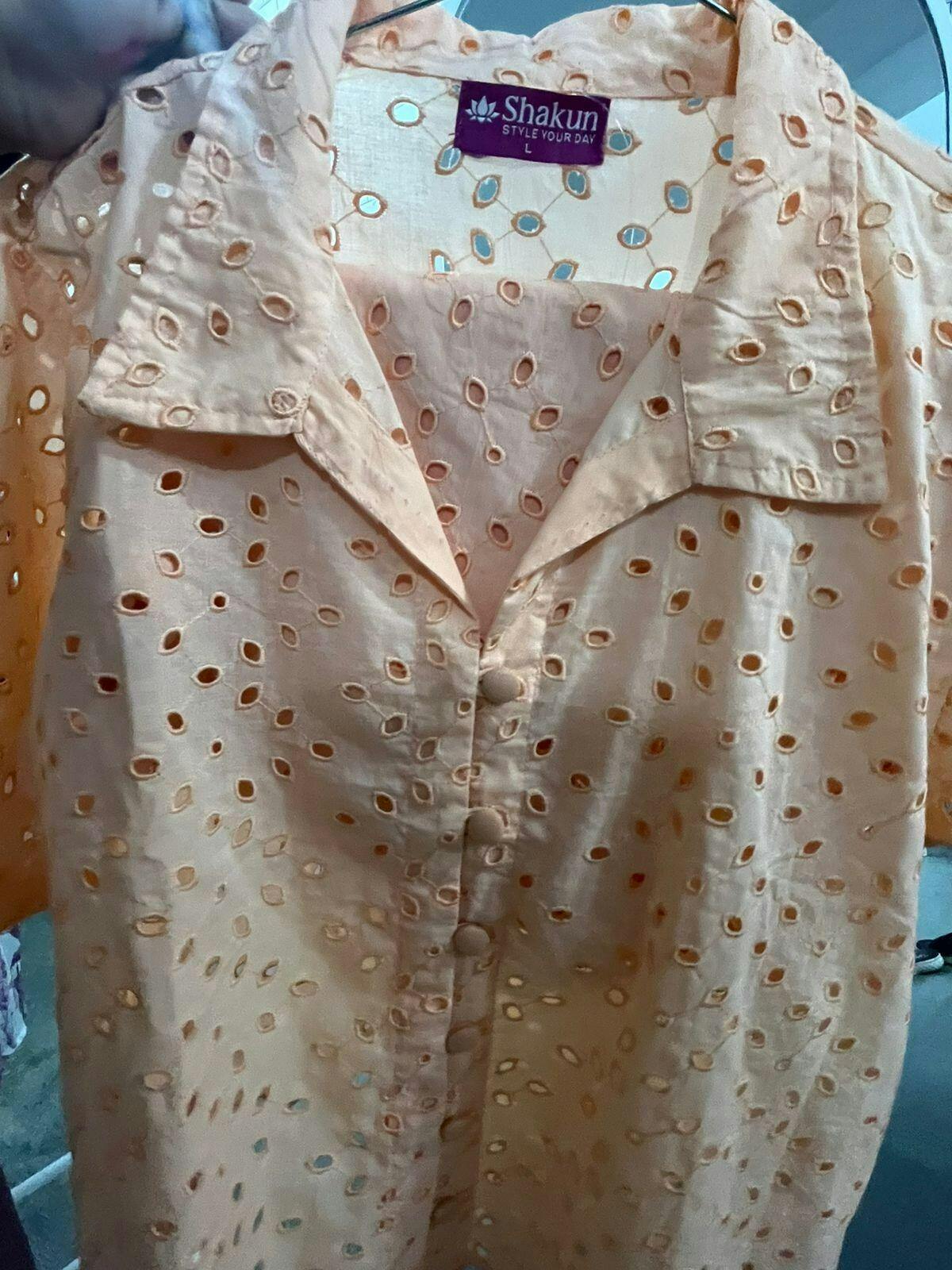 Stay comfortable and stylish in this Schiffli cord set, featuring a loose-fit Peach shirt and matching shorts made from soft, breathable cotton. Perfect for vacations, weekend plans, or casual outings, this set relaxed, effortless charm. The airy fit keeps you cool all day, while the long pockets add a playful. Not in the mood for shorts? Pair the shirt with any pants for a more covered look. Lightweight, versatile, and chic—this set is your go-to for everyday comfort without compromising on style.