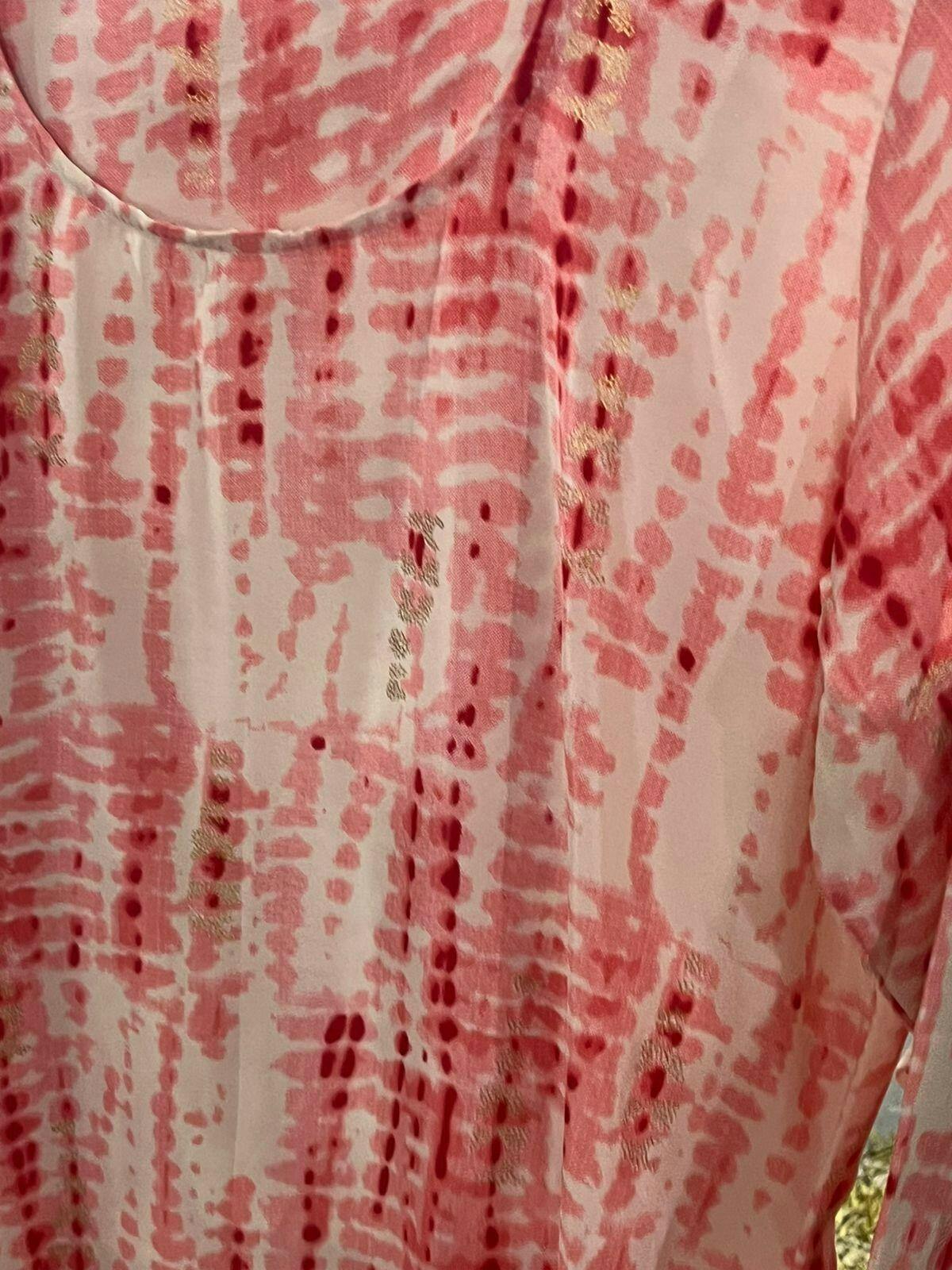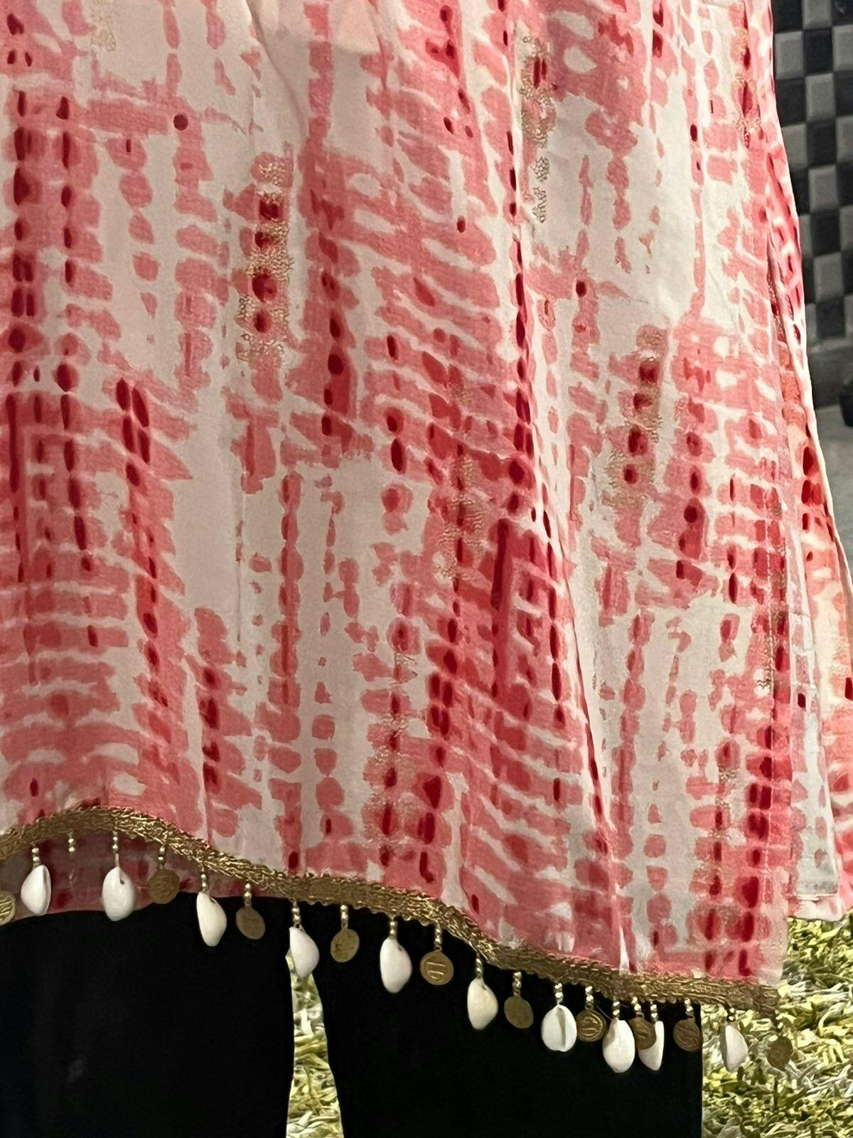 Soft Shibori fabric with a golden embossed design adds a touch of elegance and makes this outfit truly stand out. Crafted from lightweight, breathable material, it's designed for effortless wear and all-day comfort. The flowy silhouette allows for ease of movement—perfect whether you're celebrating at home, attending a festival, or enjoying a small gathering.